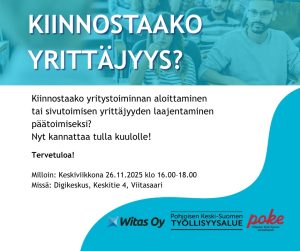 Tervetuloa Kiinnostaako yrittäjyys -tapahtumaan ke 26.11.2025 klo 16–18 Digikeskukseen (Keskitie 4).