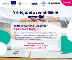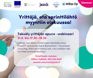 Tervetuloa Tekoäly yrittäjän apuna -webinaariin 31.8.2023 klo 17.30–18.30. Vinkkejä mm. tekstin tuottamiseen tekoälyllä antaa ChatGPT-asiantuntija Patrik Björkenheim / Arrowhead Consulting. Webinaarin aikana opitaan miksi yrittäjien tulisi kiinnittää huomiota tekoälyyn. Tilaisuuden teemoina muun muassa tekoälyn hyödyntäminen asiakaspalvelussa ja viestinnässä markkinointitekstien tuottamisessa markkinoiden tunnistamisessa ideoinnissa ja innovoinnissa Ilmoittaudu mukaan: Hilkka Heikkilä, 050 430 8407, etunimi.sukunimi@jamk.fi.