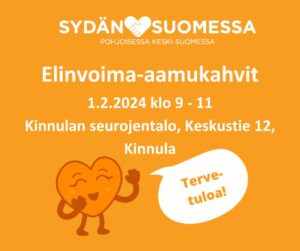 Tervetuloa Kannonkosken, Karstulan, Kinnulan, Kivijärven, Kyyjärven, Pihtiputaan ja Viitasaaren yhteisille Sydänsuomen elinvoima-aamukahveille! Tarjolla on ajankohtaista asiaa yritysten vastuullisuudesta ja tulevaisuudelle hyvästä bisneksestä. Parhaimmillaan kestävä toiminta on yrityksen kilpailuetu. Kuulemme myös uusimmat kuulumiset Sydänsuomen yhteisistä kehittämishankkeista yritysten näkökulmasta. Aika: to 1.2.2024 klo 9.00–11.00 Paikka: Kinnulan Seurojentalo, Keskustie 12, Kinnula Ohjelma: 8.30–9.00 Aamukahvit tarjolla 9.00 Tervetuloa! 9.05… Lue lisää »Sydänsuomen Elinvoima-aamukahvit Kinnulassa